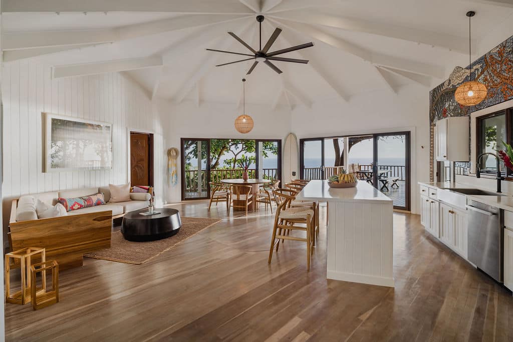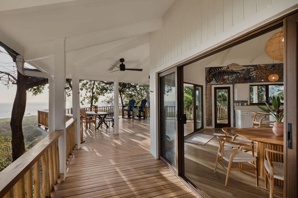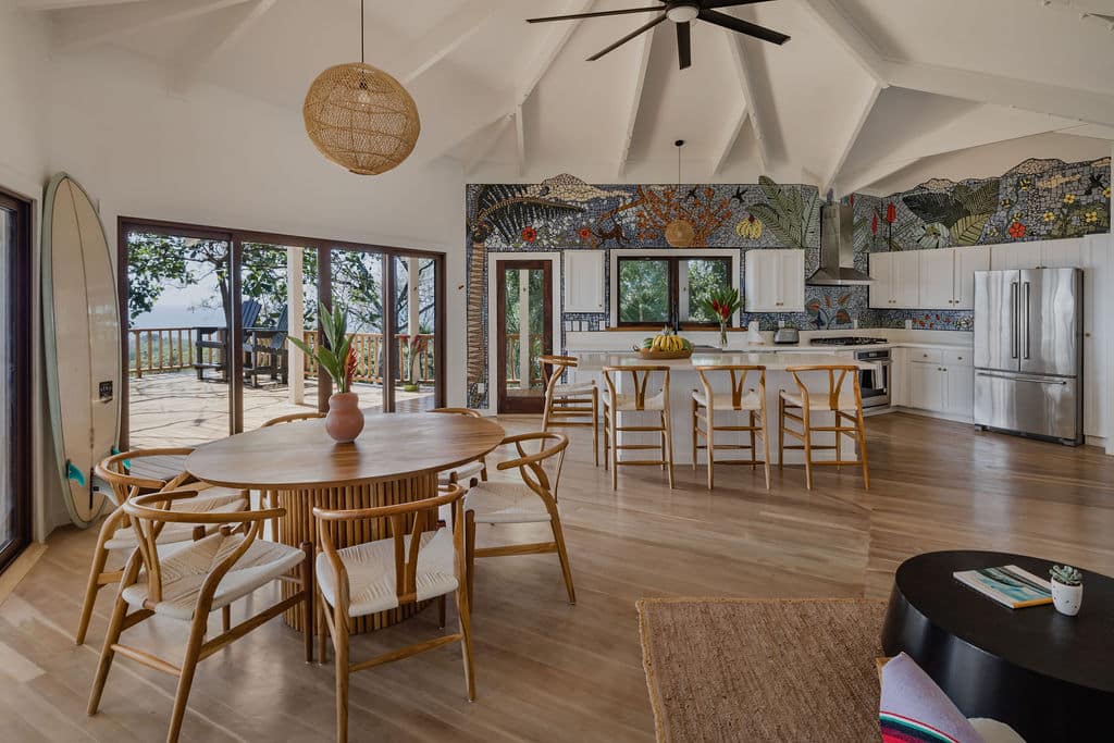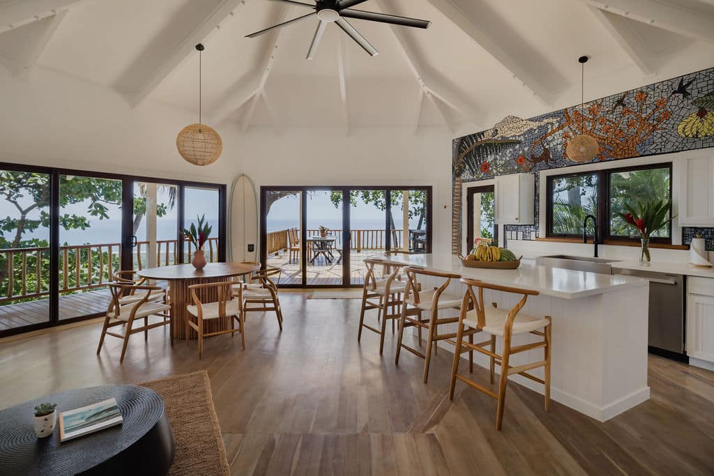 The main residence features four bedrooms and three bathrooms, with every bedroom enjoying ocean views. The heart of the home is an open-concept kitchen, dining, and living area that extends seamlessly onto a teak deck perched at canopy level, immersing the space in the surrounding jungle while maintaining constant ocean sightlines. This elevated indoor-outdoor design creates a natural flow ideal for both daily living and entertaining.
