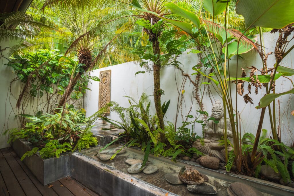 Envelop yourself in opulent light: GE Monogram kitchens for gourmet ease, custom Balinese accents evoking distant adventures. Four light-filled bedrooms , and Four-and-a-half baths shine with Kohler fixtures, Italian Atlas-Concord tiles, and Toto toilets. The magic? Haiku fans over upscale fabrics, Balinese artifact shelving, and four fountains in verdant courtyards for “forget-where-you-are” tranquility.